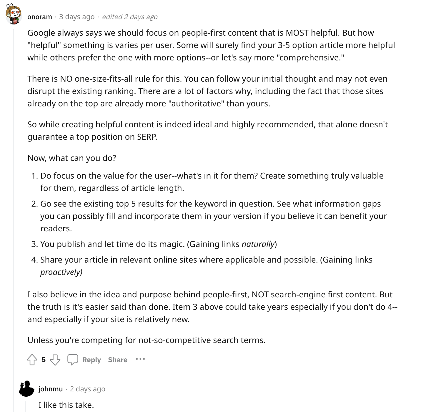 C’est la réponse à laquelle John Mueller de Google a déclaré « J’aime cette prise » sur Reddit. En voici une capture d’écran :
