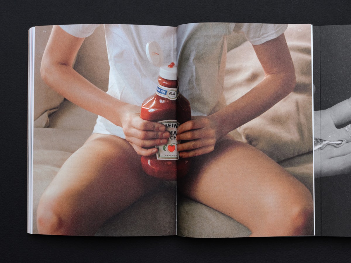 Enfin, le studio a fait appel à la photographe Polly Brown pour donner vie au premier numéro. Son image de couverture présente une photo subtilement suggestive d'un œuf placé dans une bouche ouverte, tandis que les images à fond perdu à l'intérieur du numéro incluent une bouteille de ketchup placée entre des jambes ouvertes et des résidus d'eau savonneuse s'écoulant du volant d'une voiture.