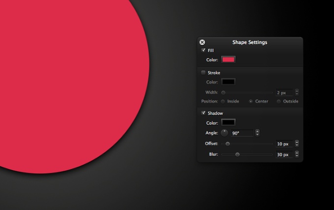Pixelmator 2.0 propose de nouvelles fonctionnalités étonnantes telles que les formes vectorielles. Sélectionnez donc le Outil Ellipse et créer un cercle. Après cela, allez dans Paramètres de forme et changez la couleur de remplissage en rouge (#d51a37).