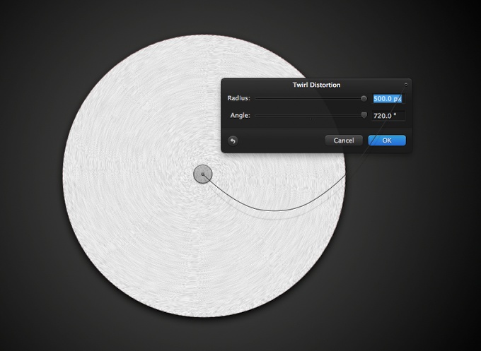 Allez maintenant à Filtre> Distorsion> Tourbillon. Utilisation 500 px pour le rayon et l’angle de 720 º.