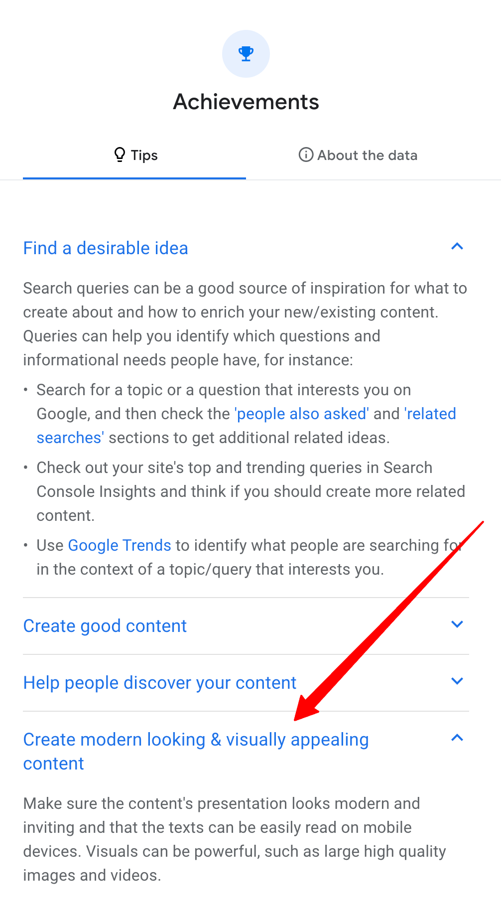 Simon Cox l’a souligné et John Mueller a répondu Mastodonte. Simon a partagé une capture d’écran de la section de conseils de Google Search Console Insights qui dit : « Créez un contenu moderne et visuellement attrayant. Assurez-vous que la présentation du contenu est moderne et attrayante et que les textes peuvent être facilement lus sur les appareils mobiles. Les visuels peuvent être puissants, comme de grandes images et vidéos de haute qualité.