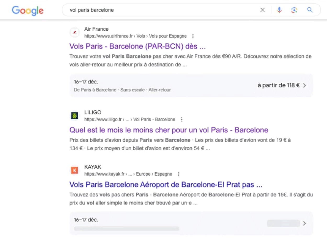 Récemment, Google nous a dit de ne pas mettre les prix des vols dans les titres car ces prix changent trop rapidement. Peut-être que Google teste la mise à jour de ces prix plus en temps réel grâce à l’utilisation de données structurées et est donc plus confiant pour les afficher sous forme de résultats riches et non d’éléments de titre ?