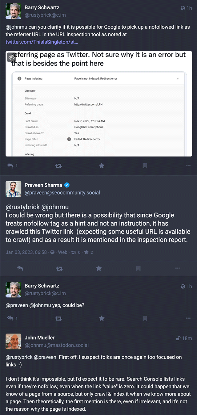 John Mueller de Google a déclaré qu’il était possible que l’outil d’inspection d’URL de Google Search Console puisse afficher un lien non suivi comme page de référence, mais il a également déclaré que c’était rare. Cela vous amène à vous demander si Google considère le nofollow comme un indice très strict ou non, mais John a déclaré que nous sommes « trop ​​concentrés sur les liens ».
