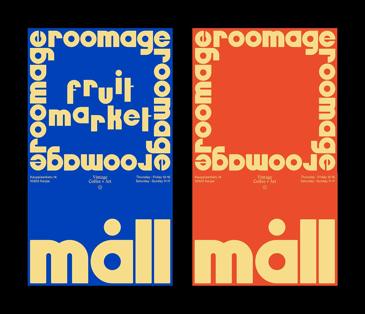 Måll, un espace polyvalent situé à Karjaa, en Finlande, a collaboré avec le designer Chris Bolton, basé à Helsinki, pour créer une nouvelle identité. Situé dans une ancienne épicerie, Måll est composé de deux boutiques vintage (Roomage et Fruit Market), d'un café végétalien et d'un espace d'exposition d'art. Les fondateurs recherchaient une identité qui pourrait englober leur système circulaire et leur éthique progressiste, tout en apportant du dynamisme à leurs communications.