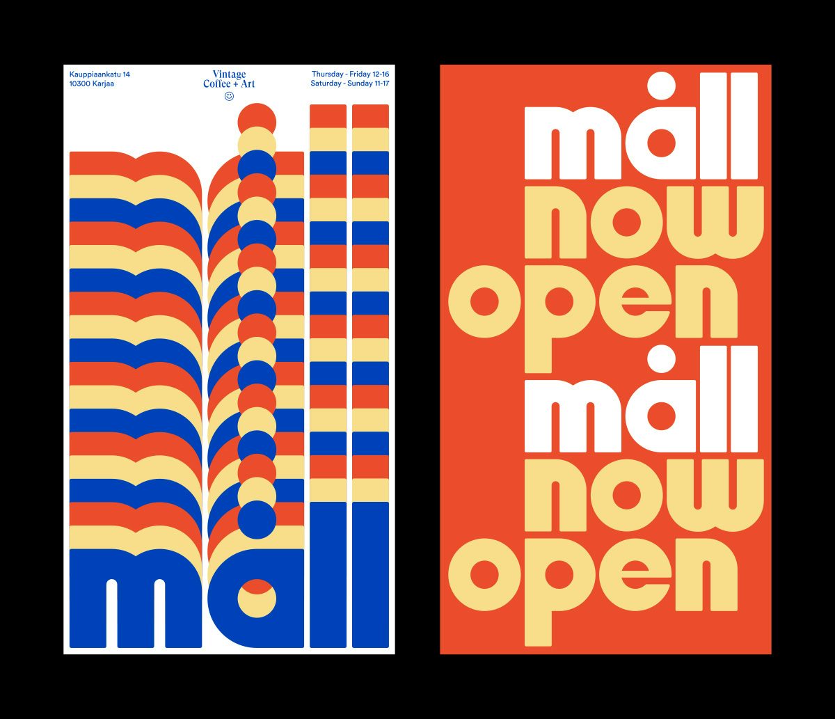Ailleurs, la palette de couleurs se compose de trois couleurs primaires représentant les trois différentes zones du Måll : les boutiques vintage, le café et l’espace d’exposition. Le bleu, le jaune et le rouge confèrent à l’identité un côté rétro, mais font également référence à « l’énergie positive d’un magasin qui s’ouvre dans un ancien supermarché vacant depuis un certain temps », explique Bolton. « En choisissant des couleurs vives, en créant un logo audacieux et des formes circulaires, j’ai pu apporter un peu de dynamisme à l’identité. »