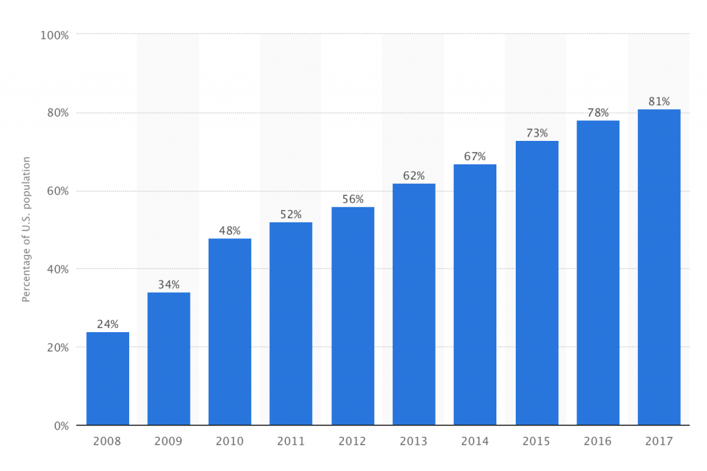 Les données recueillies par Statista montrent que 81 % de la population américaine a un profil sur les réseaux sociaux, en hausse de plus de 100 % depuis 2009.