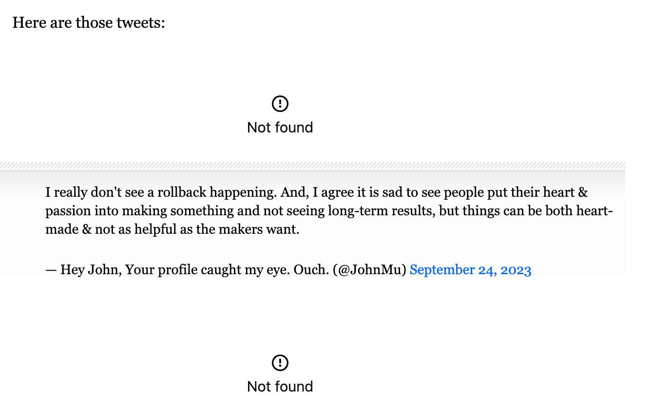 John a supprimé les tweets liés au fait que Google n’a pas annulé la mise à jour du contenu utile. Si vous lisez cette histoire, vous pouvez voir que les tweets ont été supprimés, mais les intégrations que j’ai utilisées affichent toujours le texte de son tweet.