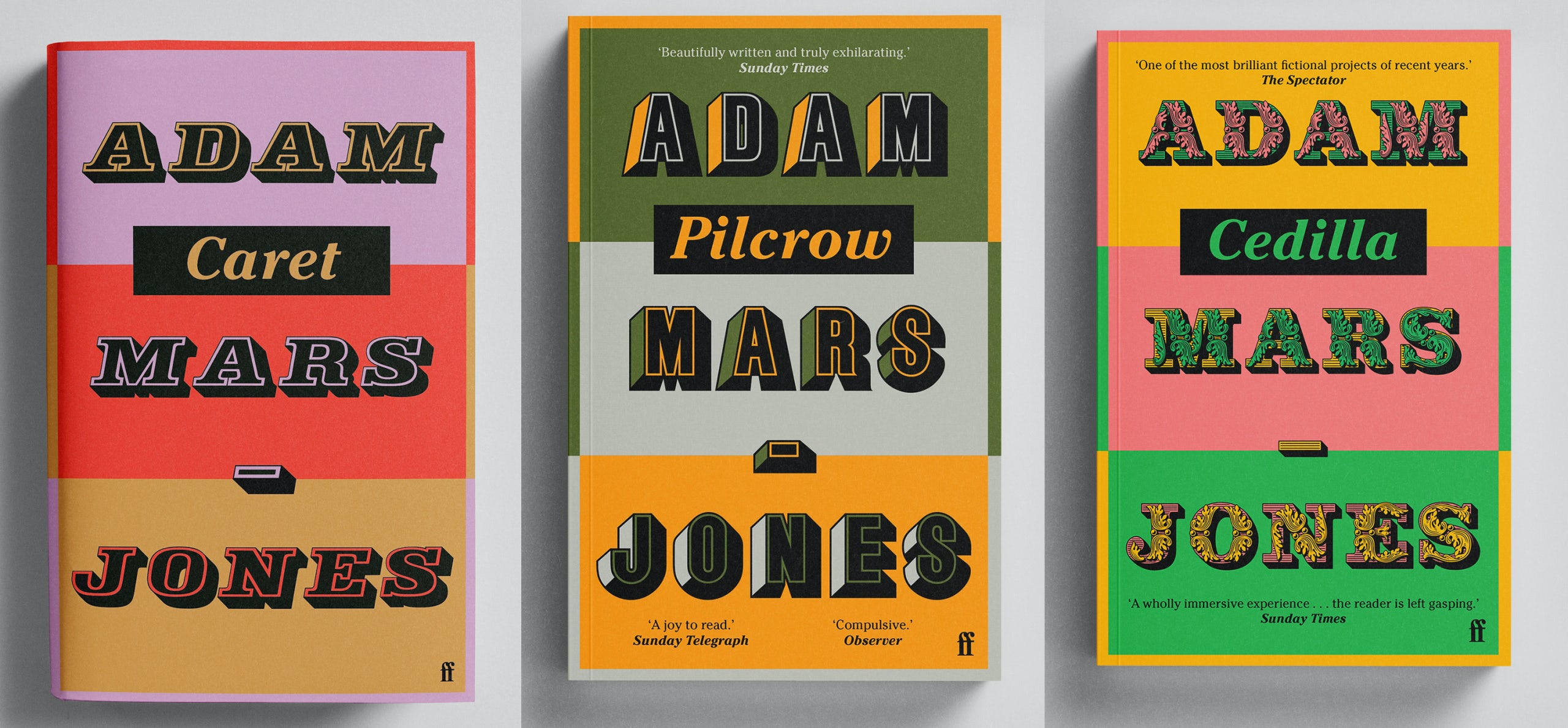 Le dernier livre d’Adam Mars Jones, Caret, a donné à Jonny Pelham l’occasion de rafraîchir les couvertures de ses romans précédents Pilcrow (2008) et Cedilla (2011) et me donne l’occasion de souligner sa brillante approche du trio. Utiliser des polices de caractères Buxom – une adaptation de Baby Fat de Milton Glaser – sur Pilcrow ; Lettres Ornées sur Cedilla ; et Profil sur Caret, Pelham s’appuie sur les formes audacieuses du nom de Jones et laisse les lettres (et les couleurs) faire le travail.