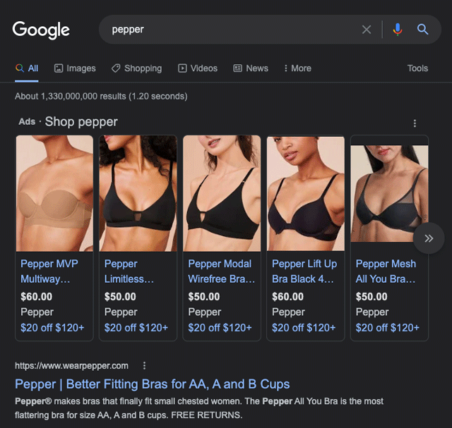 Google a peut-être fait cela pour le terme et le nom de la marque [pepper] – où maintenant Google affiche une boîte d’achat en haut du résultat pour la marque Pepper de sous-vêtements pour femmes.