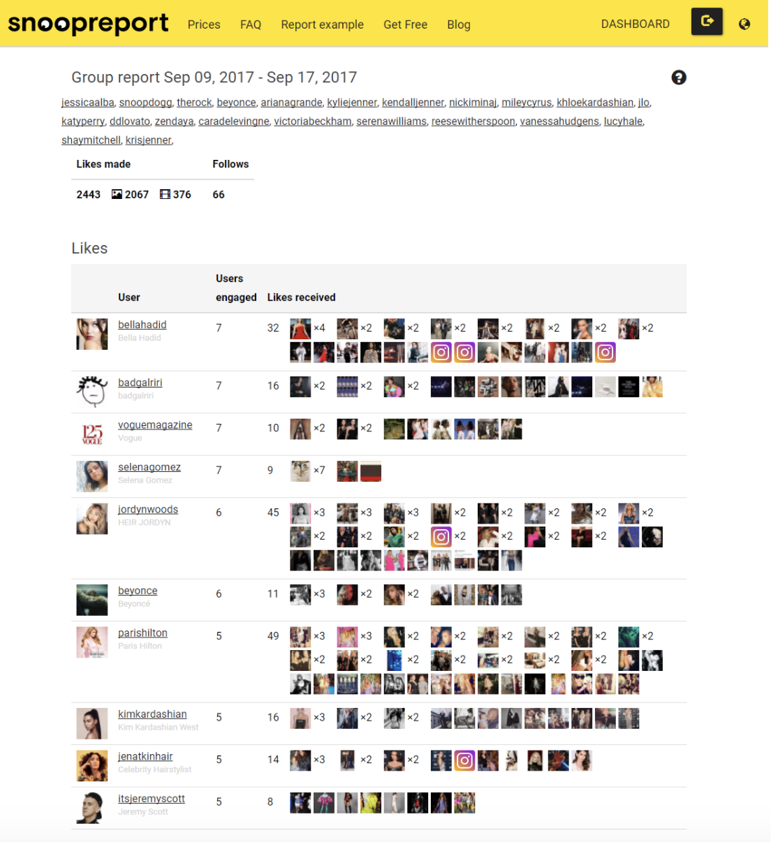 Snoopreport ne montre pas seulement comment vos concurrents se portent bien, mais il surveille également l’audience. Il permet le suivi du groupe de comptes avec un rapport de groupe combiné, pour vous apporter leurs intérêts et habitudes, afin que vous puissiez improviser en conséquence et les engager avec un meilleur plan. Voir l’étude de cas du rapport du groupe snoopreport https://blog.snoopreport.com/2017/10/06/group-reports-with-instagram-user-actions-data/