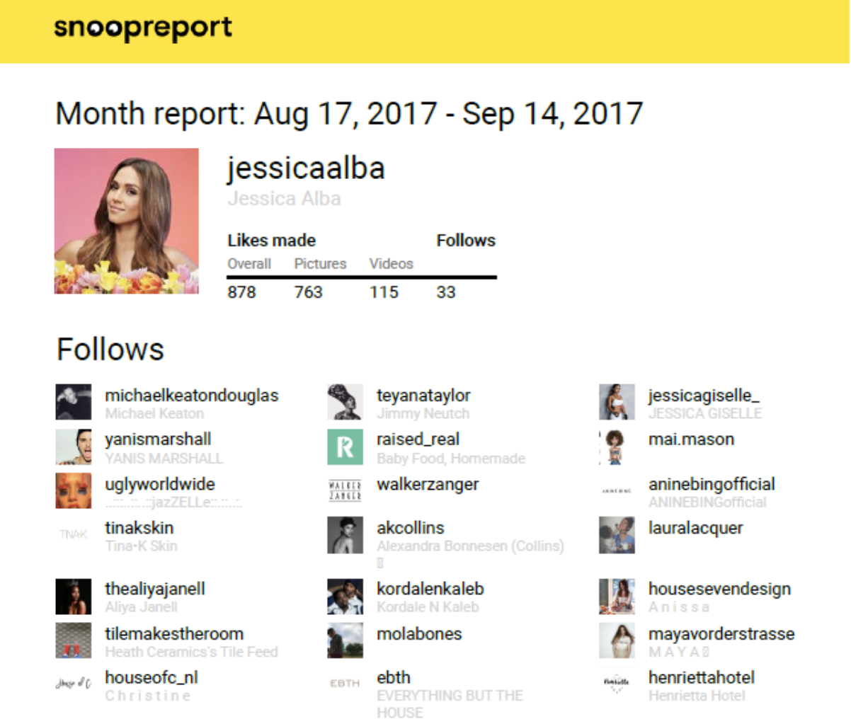 Snoopreport est la plateforme de surveillance d’Instagram. Il suit les actions des utilisateurs sur Instagram comme les goûts, les commentaires et les suivis. Le service fournit des données sur l’activité des utilisateurs dans des rapports PDF hebdomadaires et mensuels, toutes les actions des utilisateurs au format CSV pour des analyses approfondies et des rapports de groupe pour la recherche sur le comportement des groupes d’utilisateurs. https://snoopreport.com/fr/